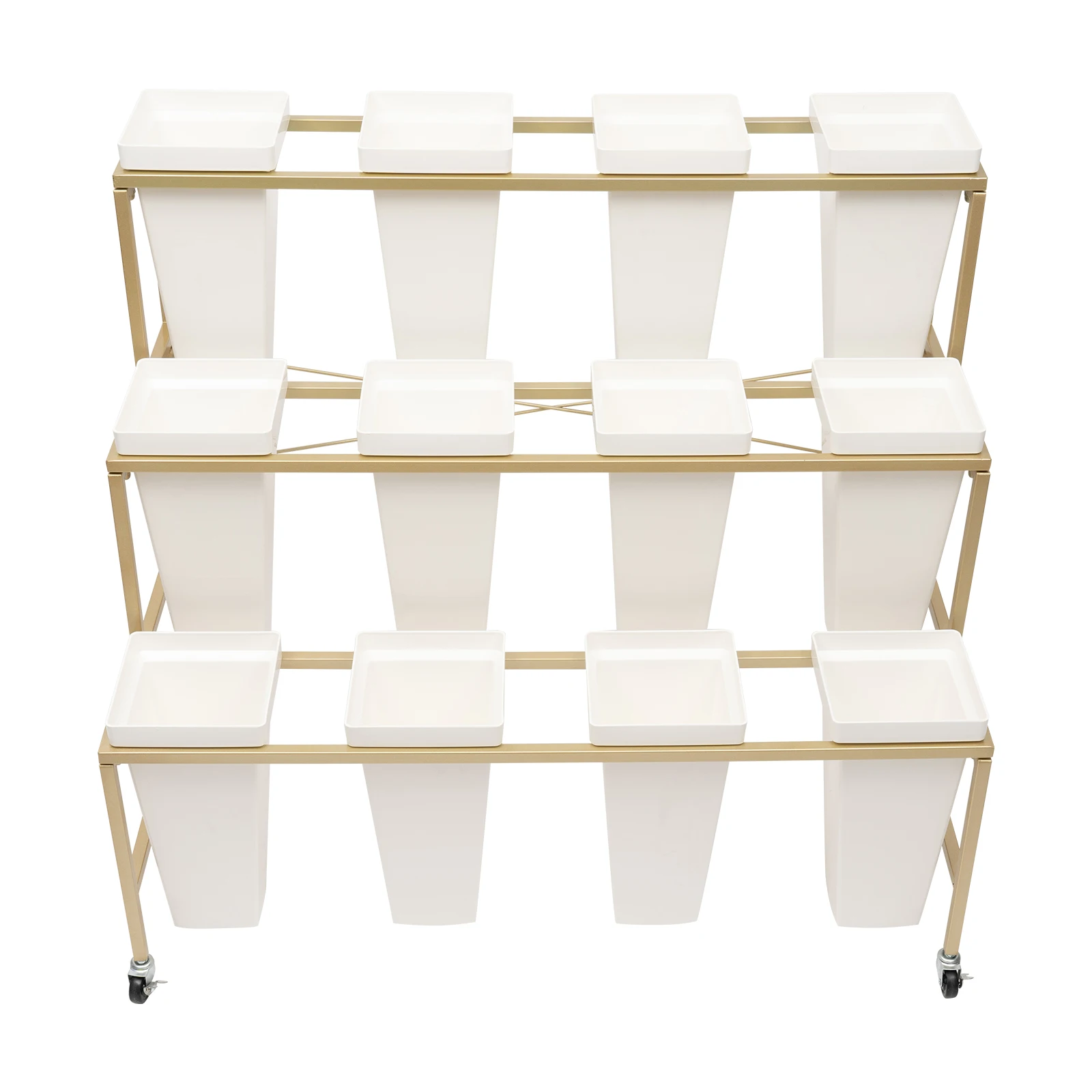 3 Layers White Flower Display Stand Heavy Duty Metal Plant Cart Shelf with 12 Buckets & Wheel for Home Patio Garden Florist