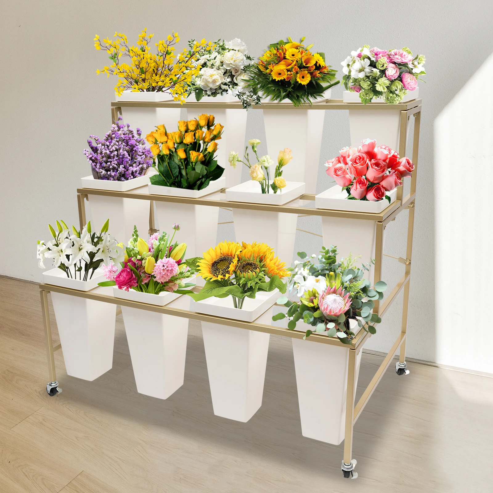 Multi-layer Structure: Not only can the stepped design make full use of vertical space to help each flower get enough care, but you also can place different types or colors of flowers to increase the diversity of the display, facilitating customers or viewers to appreciate the beauty of flowers from various angles.