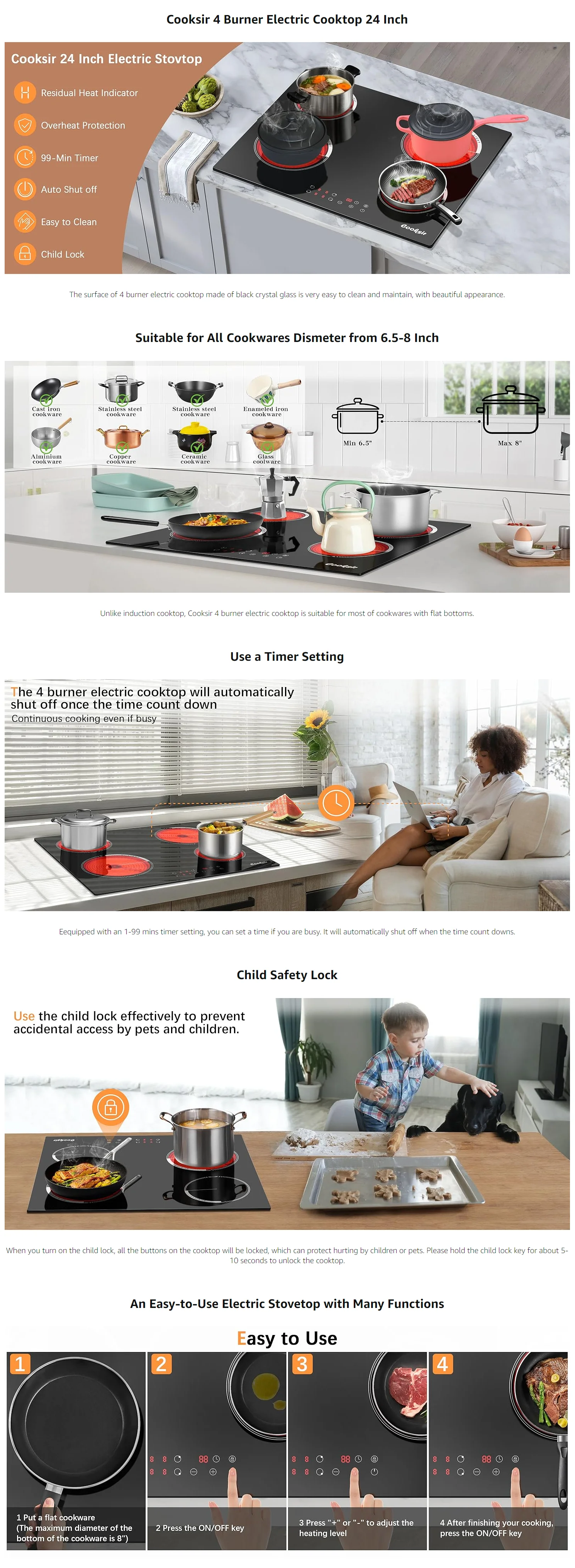 Cooksir 4 Burner 24 Inch Electric Cooktop,Timer, Kids Safety Lock, 9 Heating Level, 220V Hard Wired(No Plug),Drop-in 220V-240V