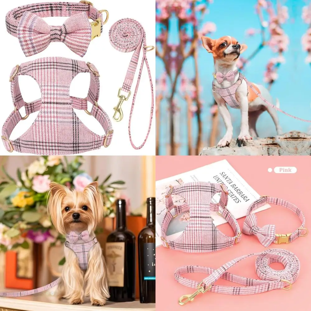 - Dog Harness Collar & Leash : One set include all will meet all your needs! Cute classic plaid dog harness come with a pet leash and a pet collar. Wearing chic set for both male and female dogs on a Wedding,New Year,Birthday & Holiday Gifts,Party Costume,Christmas,Photo Shot and Family Picnic will make your dog looks very charming and fashionable