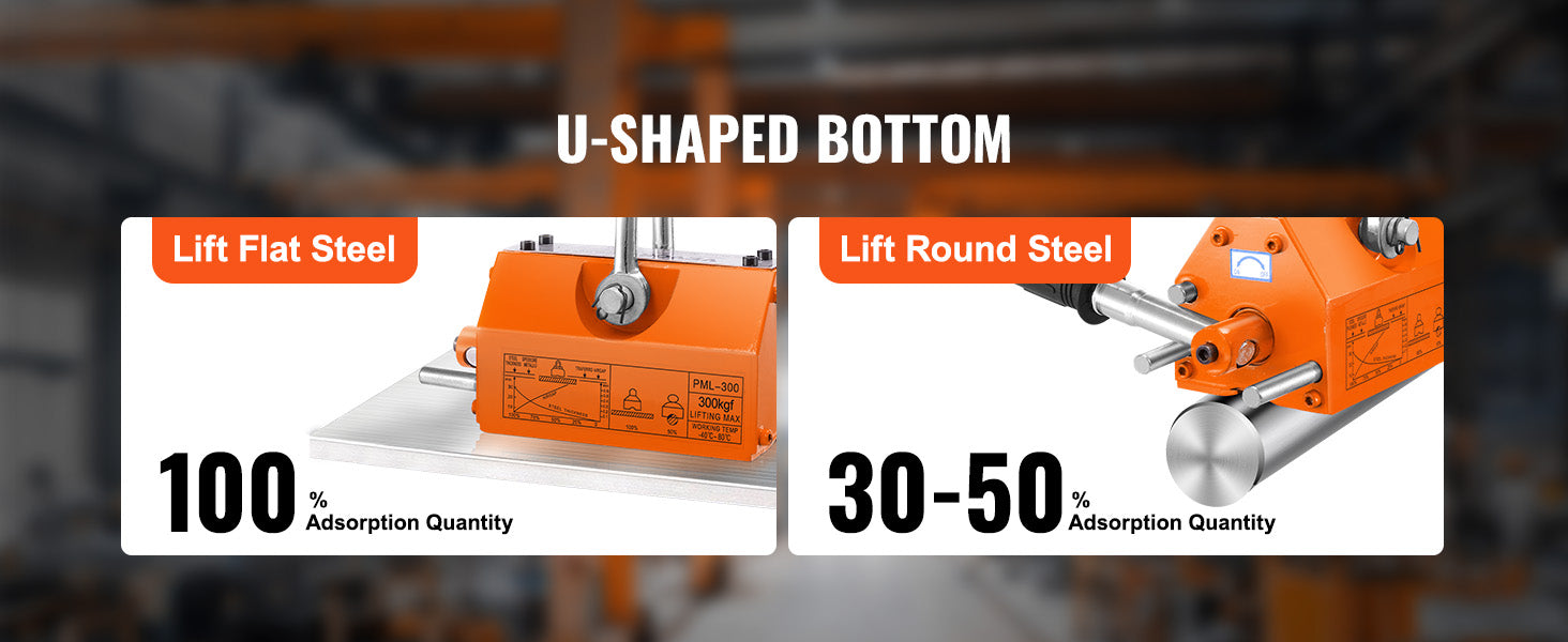 U-Shaped Groove: The U-shaped bottom groove is compatible with both flat plates and round steels, boosting a wider range of applications. This permanent lift magnet is an excellent sheet metal lifting tool for the electricity, engineering, transportation, and mining industries.
