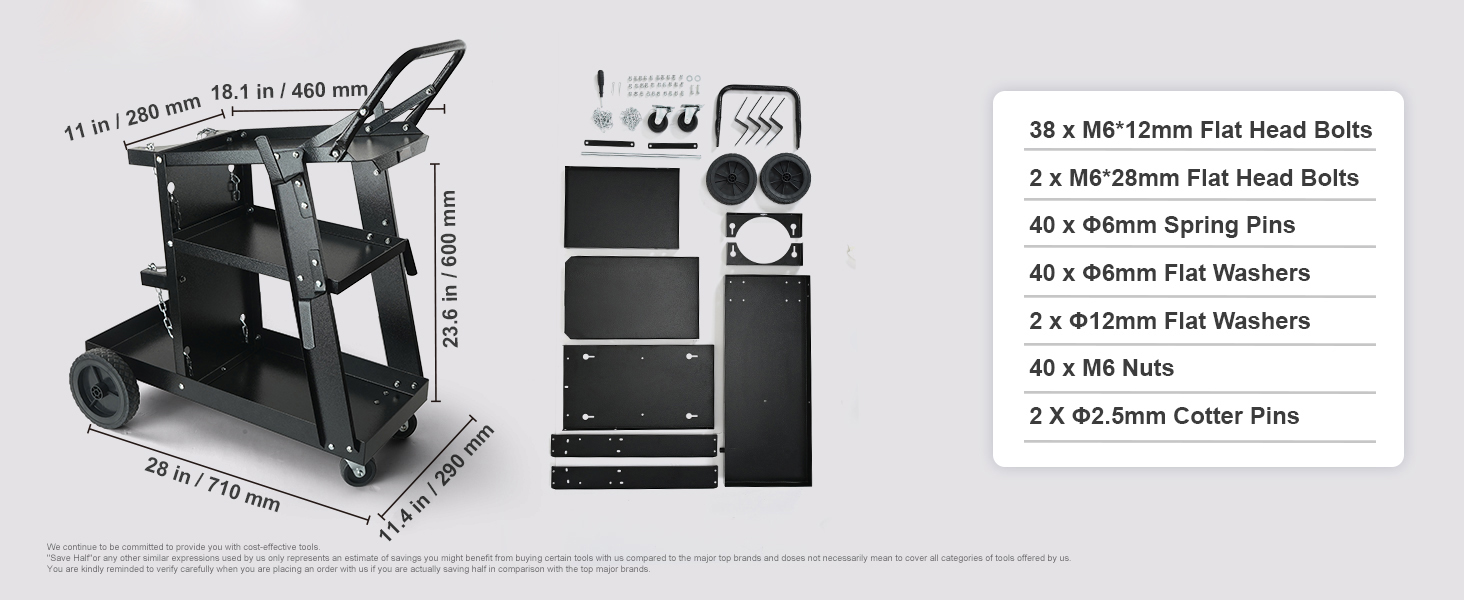 Premium Quality and Easy Installation: This rolling welding cart is built with durable steel that offers exceptional strength and withstands heavy-duty use, resistant to abrasion and deformation for smooth movement. Precise hole positioning design allows for effortless and quick assembly. Upper & Medium Tray Size: 11 x 18.1 in ; Lower Tray Size: 28 x 16.1 in ; Max Static Load Capacity: 400 lbs ; Max Dynamic Load Capacity: 370 lbs.