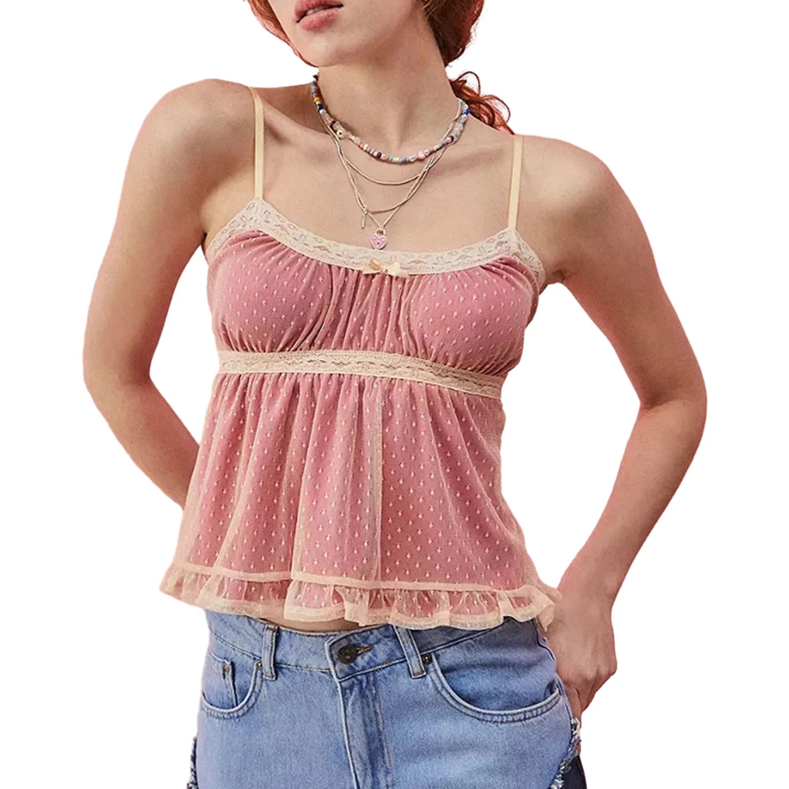 Women s Sweet Cami Tops Mini Bowknot Front Spaghetti Strap Lace Trim Vest Show Navel Cropped Camisole
